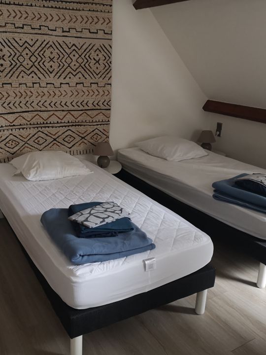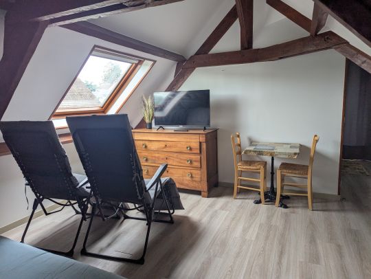 - Une pièce où se trouve 3 lits simples (possibilité de faire un lit double), 2 fauteuils et une télévision