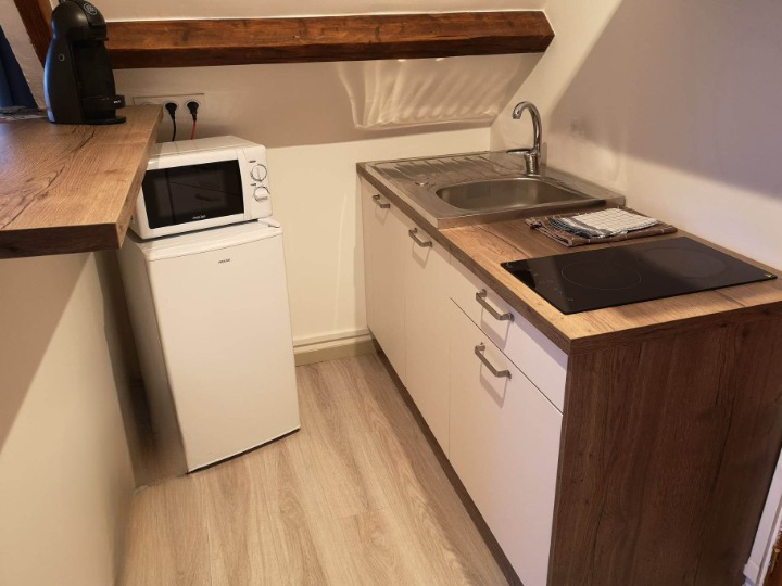 - Une cuisine équipée d’un micro-onde, une cafetière filtre, une plaque vitrocéramique, et vaisselle nécessaire.