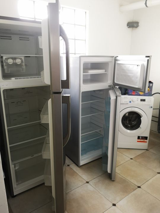 o Une buanderie avec machine à laver et plusieurs réfrigérateurs