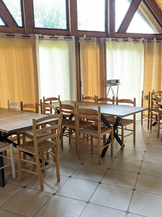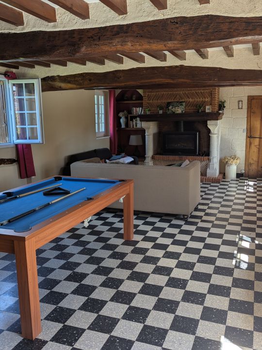 - un grand salon avec deux canapés, une télévision, un poêle à bois, un buffet où sont rangés tous les jeux de société,