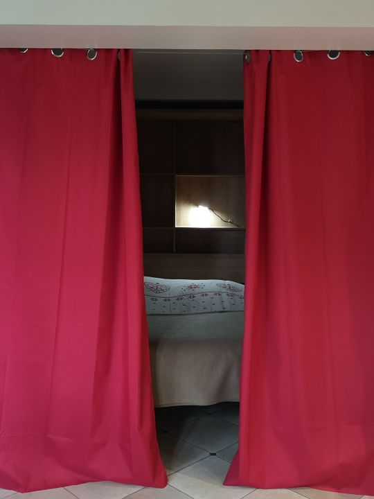 - un espace nuit, il s'agit d'un renfoncement où se trouve un vrai lit deux places (140cm), cet espace est fermé par un rideau rouge (sur la photo).