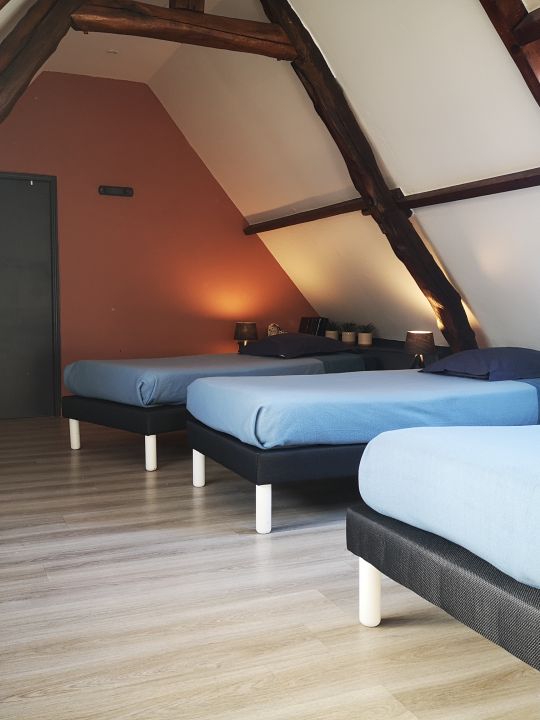 - Chambre le Coquelicot : composée de 3 lits simples, on peut créer un lit double
