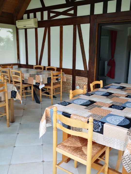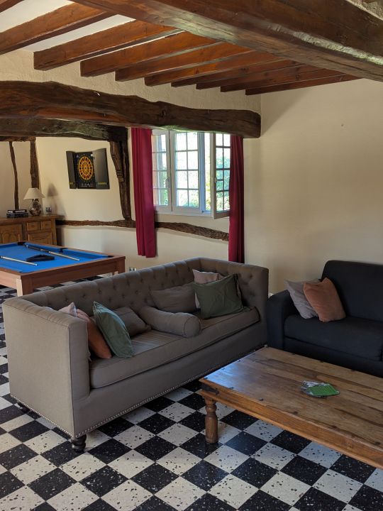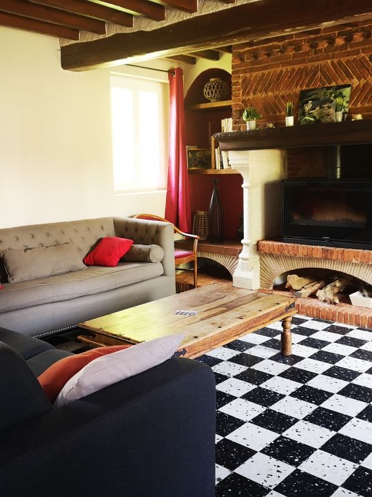 - un grand salon avec deux canapés, une télévision, un poêle à bois, un buffet où sont rangés tous les jeux de société,