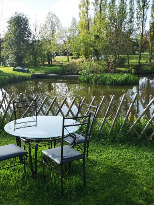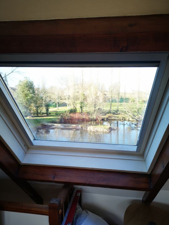 Beaucoup de fenêtres donnant de la luminosité à cet espace. Vue traversante, d’un côté le jardin, de l’autre, la vue sur l’étang.