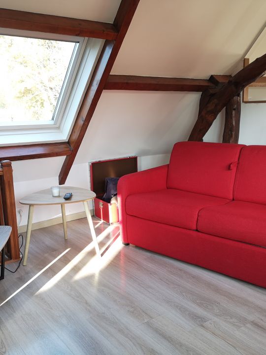 - Un espace salon avec un canapé lit (120cm = 1 personne) et une télévision