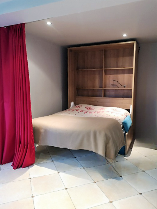 - un espace nuit, il s'agit d'un renfoncement où se trouve un vrai lit deux places (140cm), cet espace est fermé par un rideau rouge (sur la photo).